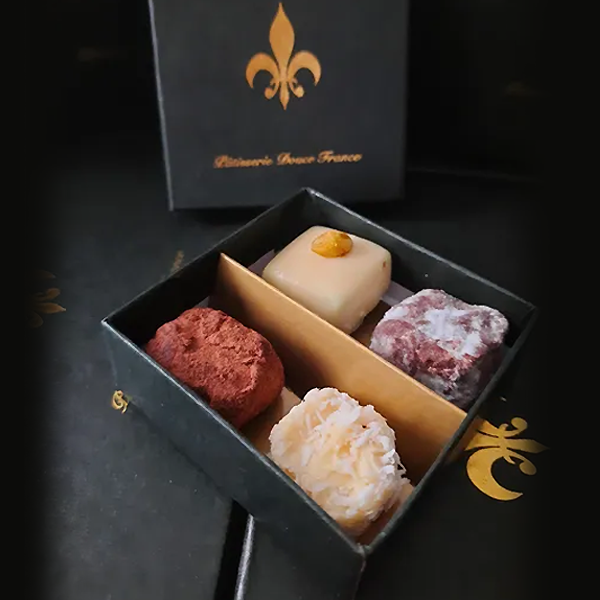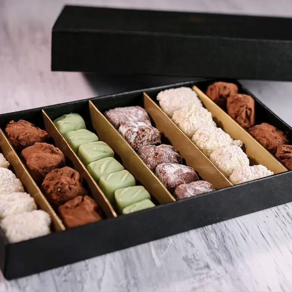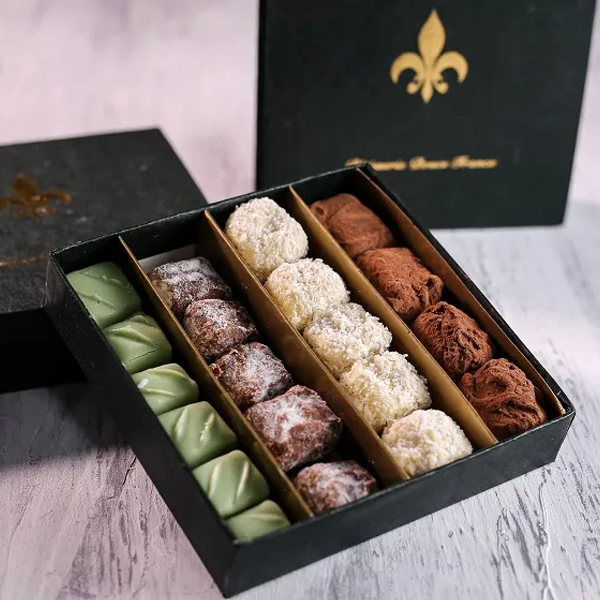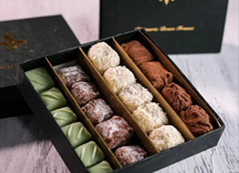 Nos sabores: chocolate 70%, chocolate branco e pistache, ganache de framboesa, e ganache de chocolate branco com côco.