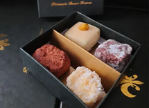 Nos sabores: ganache de framboesa, ganache de chocolate branco com côco, ganache de chocolate branco e pistache.