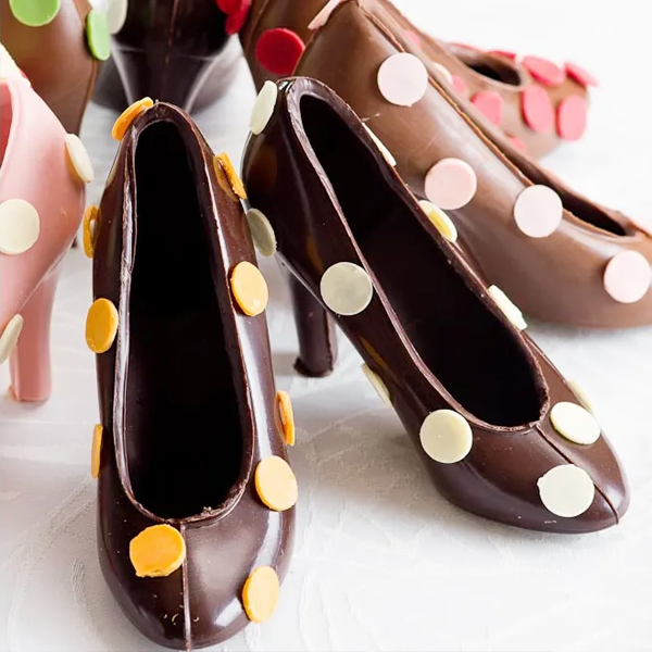 Delicioso chocolate belga ao leite em formato de scarpin. Decorado com bolinhas prateadas , pastilhas coloridas, ou todo dourado.